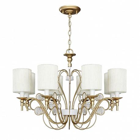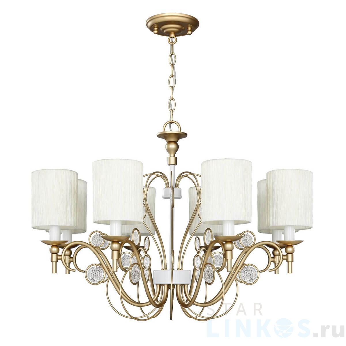 Поставщик рекомендует использовать лампы накаливания с цоколем E14 для освещения площади 17,8 м2. Подвесная люстра Favourite Lietta 2493-8P в стиле арт-деко используется в интерьере гостиной с установкой на потолок.