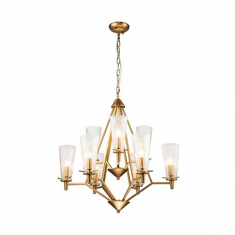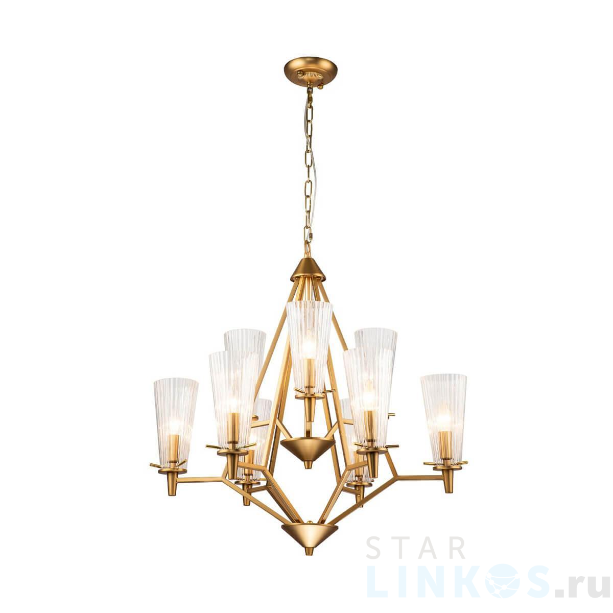 Поставщик рекомендует использовать лампы накаливания с цоколем E14 для освещения площади 18 м2. Подвесная люстра Favourite Raute 2964-9P в кантри-стиле используется в интерьере гостиной с установкой на потолок.