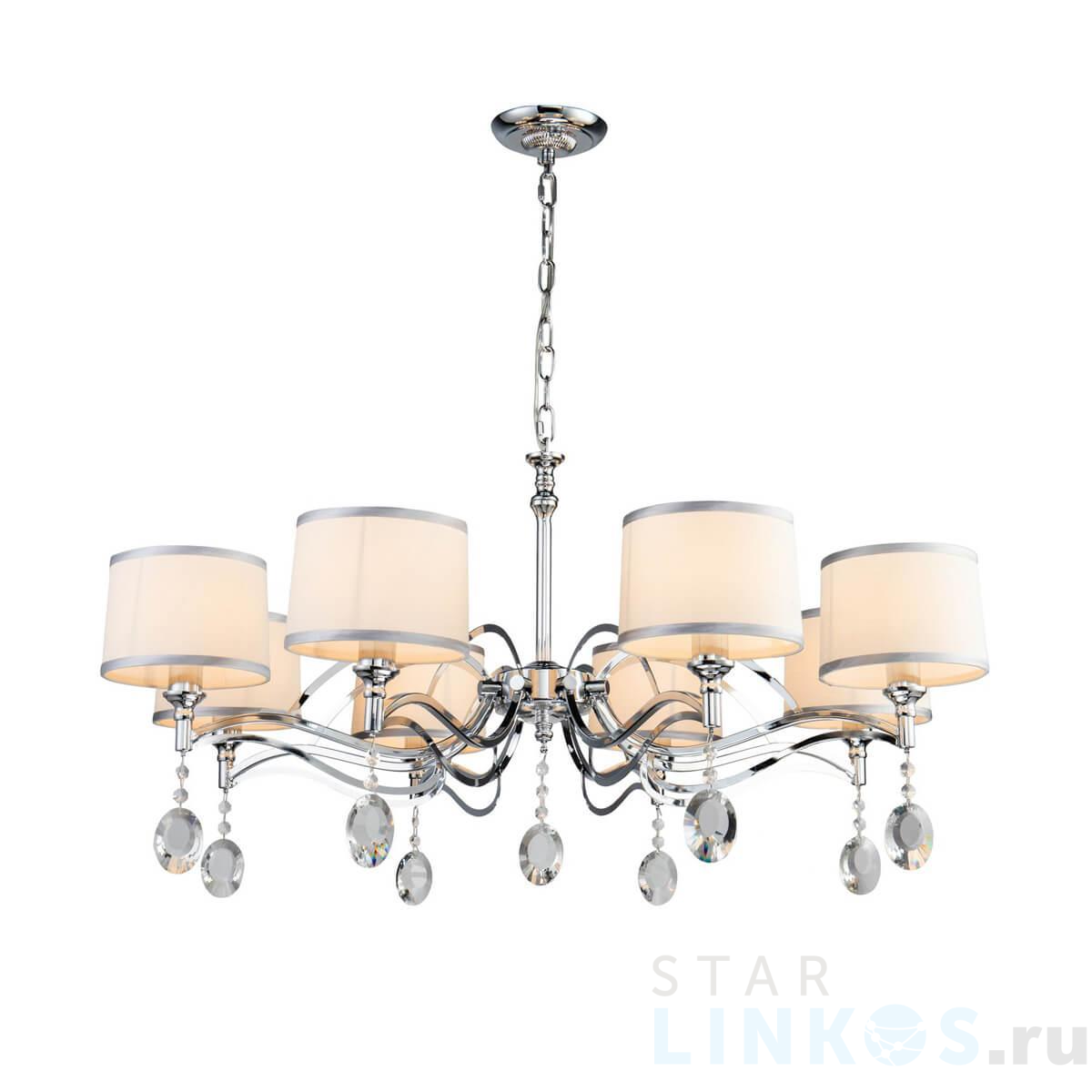 Поставщик рекомендует использовать лампы накаливания с цоколем E14 для освещения площади 17,8 м2. Подвесная люстра Favourite Semina 2707-8P в используется в интерьере гостиной с установкой на потолок.