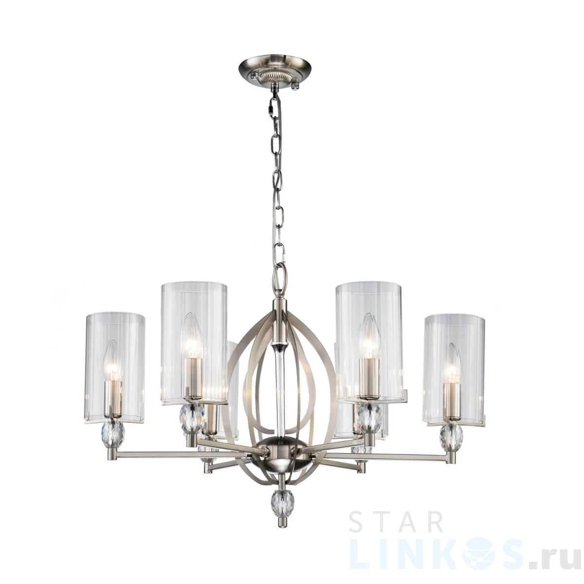 Поставщик рекомендует использовать лампы накаливания с цоколем E14 для освещения площади 13,3 м2. Подвесная люстра Favourite Stine 2704-6P в используется в интерьере гостиной с установкой на потолок.