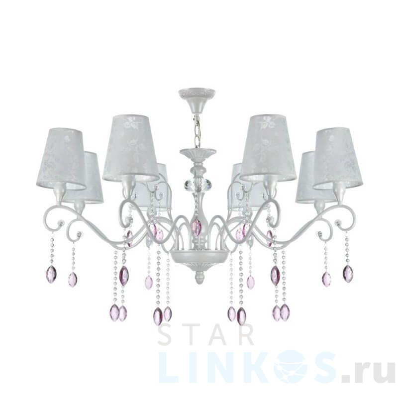 Поставщик рекомендует использовать лампы накаливания с цоколем E14 для освещения площади 17,8 м2. Подвесная люстра Freya Adelaide FR2306-PL-08-W в стиле прованс используется в интерьере гостиной с установкой на потолок.