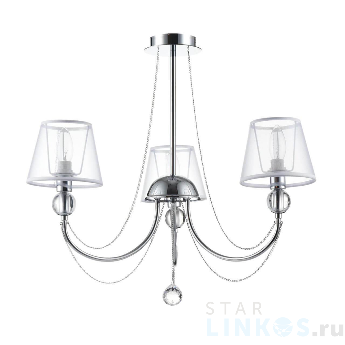 Поставщик рекомендует использовать лампы накаливания с цоколем E14 для освещения площади 6,7 м2. Подвесная люстра Freya Beverly FR5661-PL-03-CH в стиле арт-деко используется в интерьере спальни с установкой на потолок.