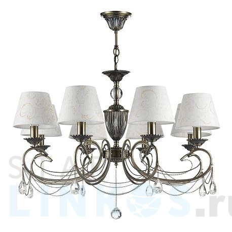 Поставщик рекомендует использовать лампы накаливания с цоколем E14 для освещения площади 17,8 м2. Подвесная люстра Freya Brossard FR2904-PL-08-BZ в стиле арт-деко используется в интерьере гостиной с установкой на потолок.