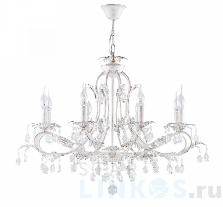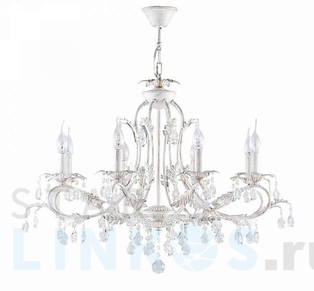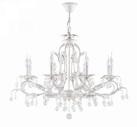 Поставщик рекомендует использовать лампы накаливания с цоколем E14 для освещения площади 26,7 м2. Подвесная люстра Freya Dezi FR3040-PL-08-WG в стиле прованс используется в интерьере гостиной с установкой на потолок.