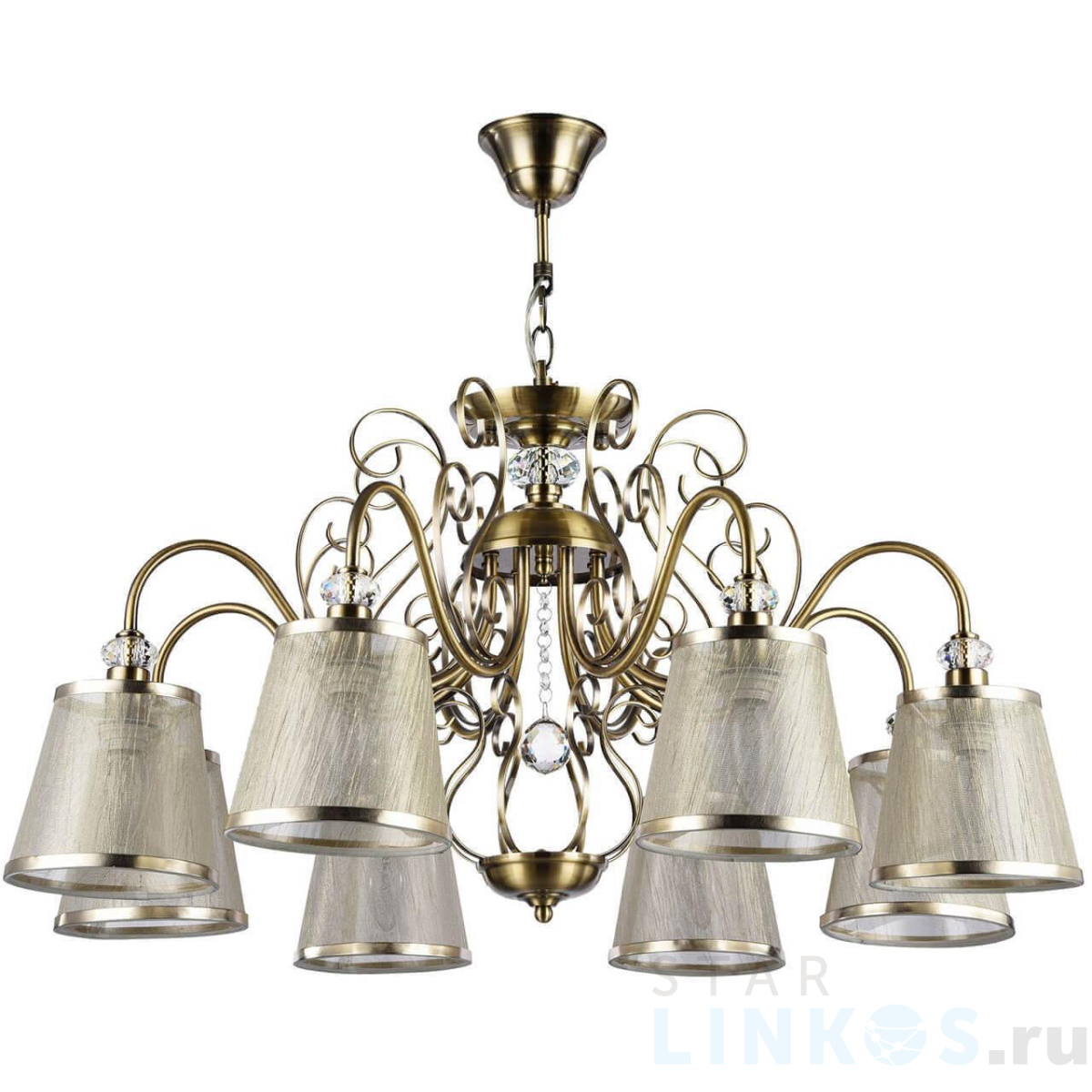 Поставщик рекомендует использовать лампы накаливания с цоколем E14 для освещения площади 17,8 м2. Подвесная люстра Freya Driana FR2405-PL-08-BZ в используется в интерьере гостиной с установкой на потолок.