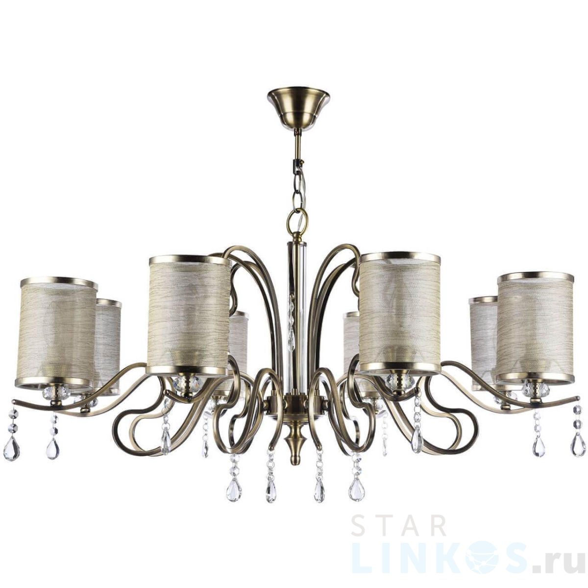 Поставщик рекомендует использовать лампы накаливания с цоколем E14 для освещения площади 17,8 м2. Подвесная люстра Freya Faust FR2300-PL-08-BZ в стиле арт-деко используется в интерьере гостиной с установкой на потолок.