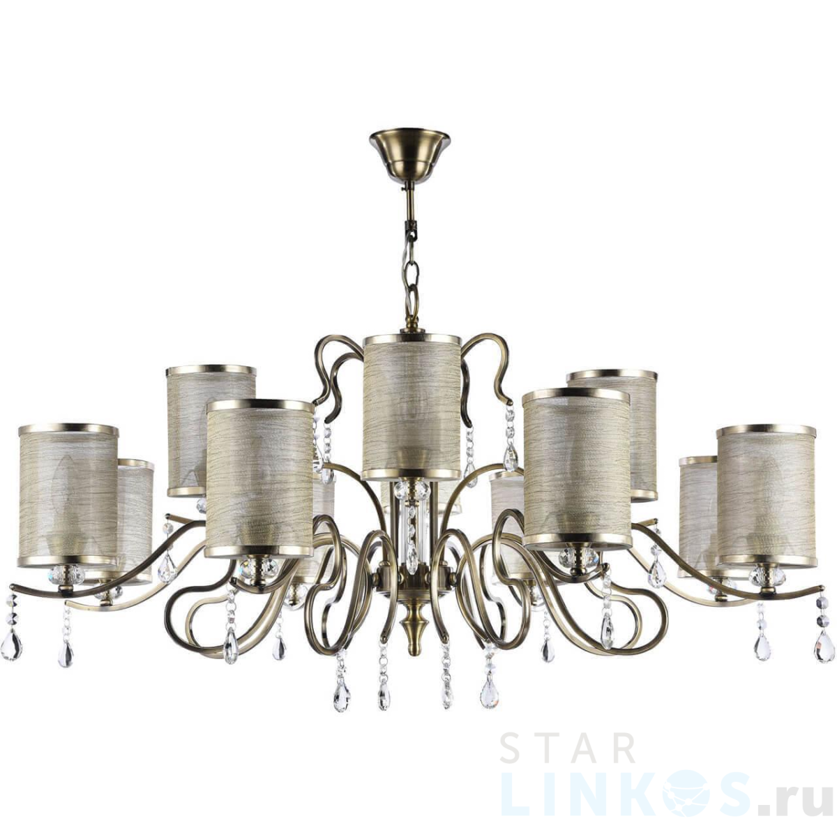 Поставщик рекомендует использовать лампы накаливания с цоколем E14 для освещения площади 26,7 м2. Подвесная люстра Freya Faust FR2300-PL-12-BZ в стиле арт-деко используется в интерьере гостиной с установкой на потолок.