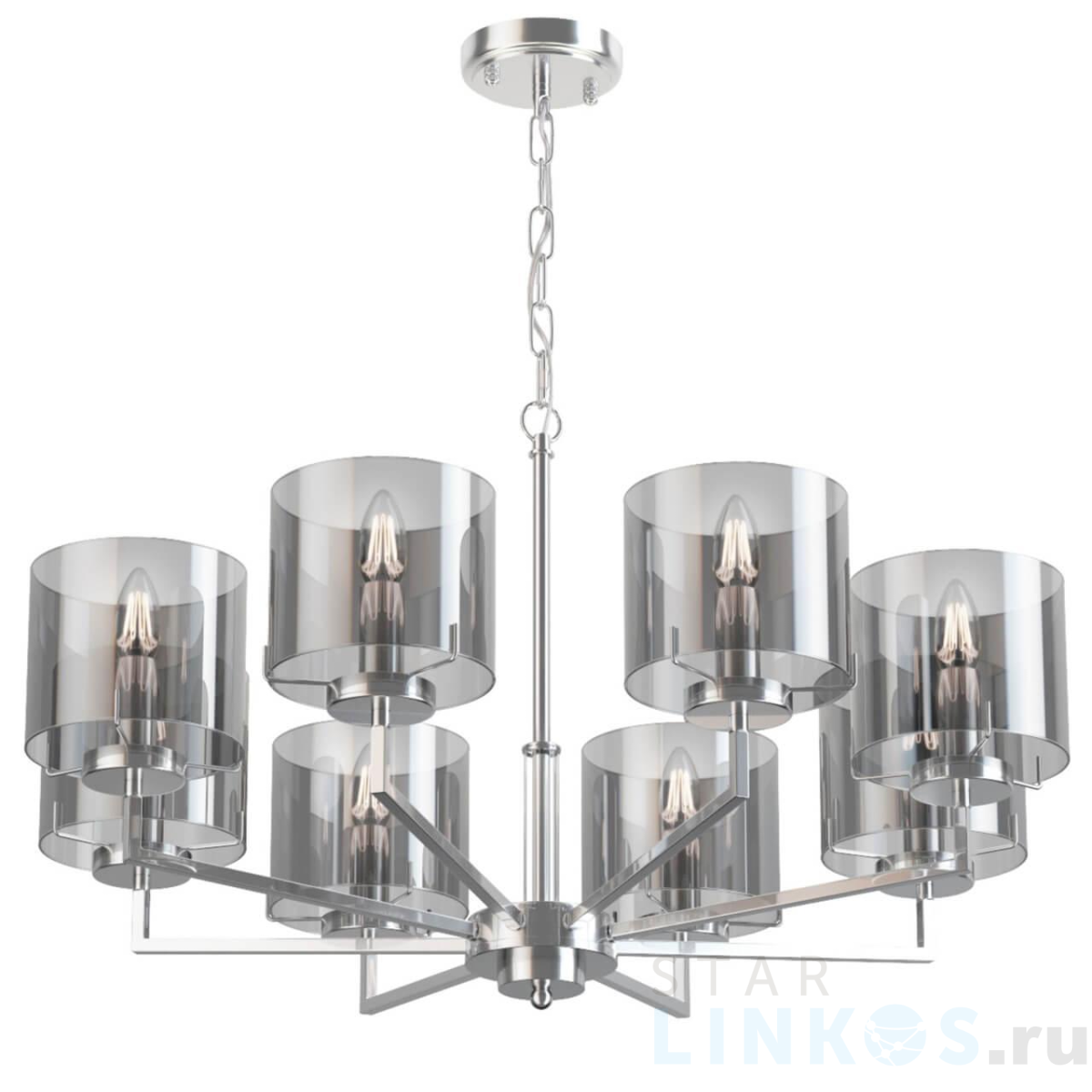 Поставщик рекомендует использовать лампы накаливания с цоколем E14 для освещения площади 17,8 м2. Подвесная люстра Freya Karen FR5096PL-08CH в современном стиле используется в интерьере гостиной с установкой на потолок.