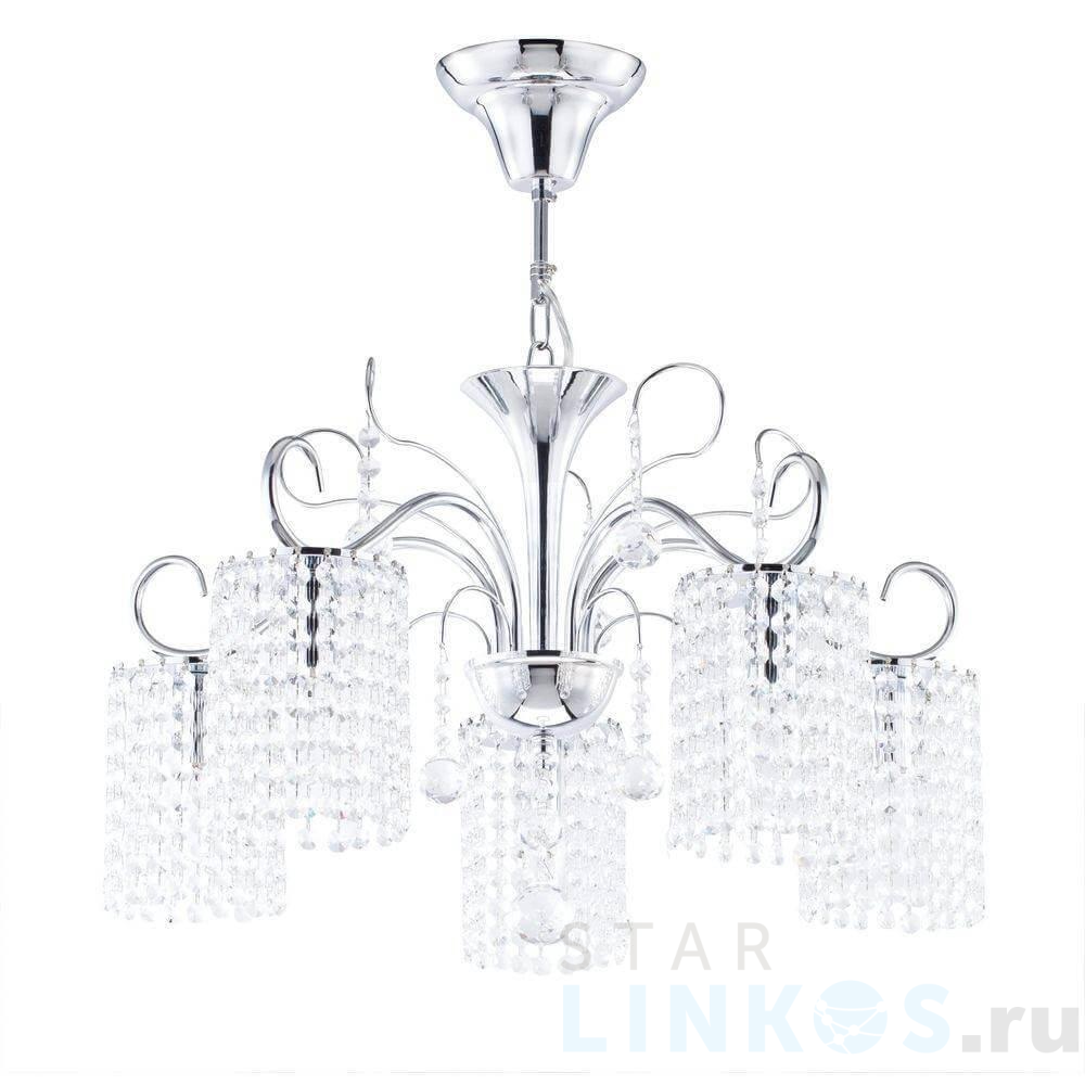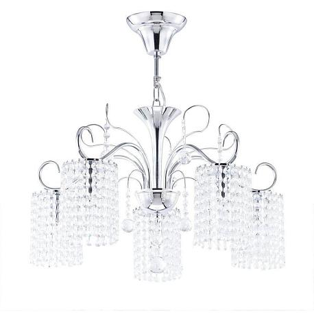Поставщик рекомендует использовать лампы накаливания с цоколем E14 для освещения площади 11,1 м2. Подвесная люстра Freya Leona FR1127-PL-05-CH в стиле арт-деко используется в интерьере спальни с установкой на потолок.