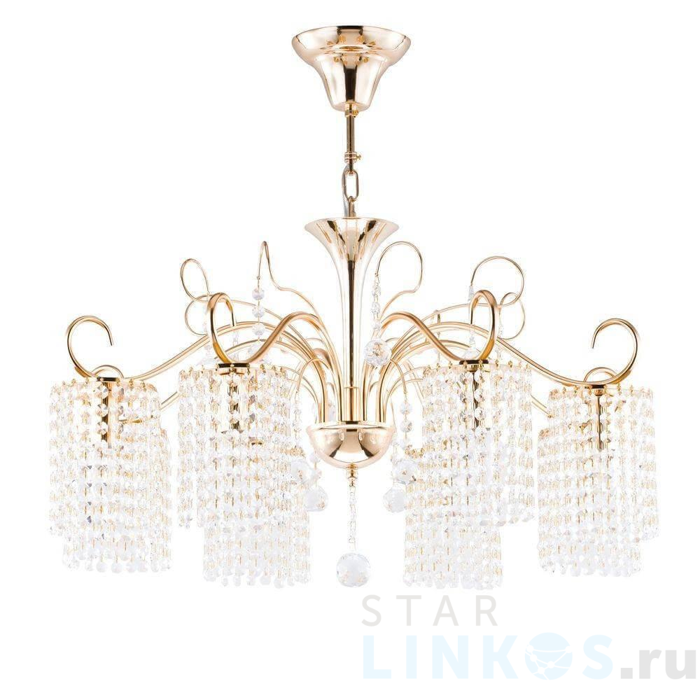 Поставщик рекомендует использовать лампы накаливания с цоколем E14 для освещения площади 26,7 м2. Подвесная люстра Freya Leona FR1127-PL-08-G в классическом стиле используется в интерьере гостиной с установкой на потолок.
