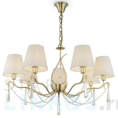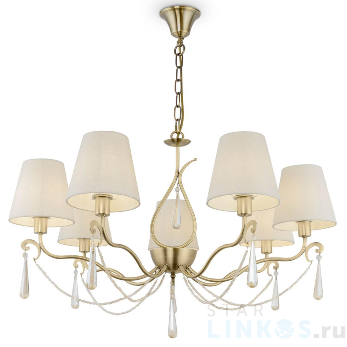 Поставщик рекомендует использовать лампы накаливания с цоколем E14 для освещения площади 15,6 м2. Подвесная люстра Freya Madeline FR2019PL-07BS в используется в интерьере гостиной с установкой на потолок.