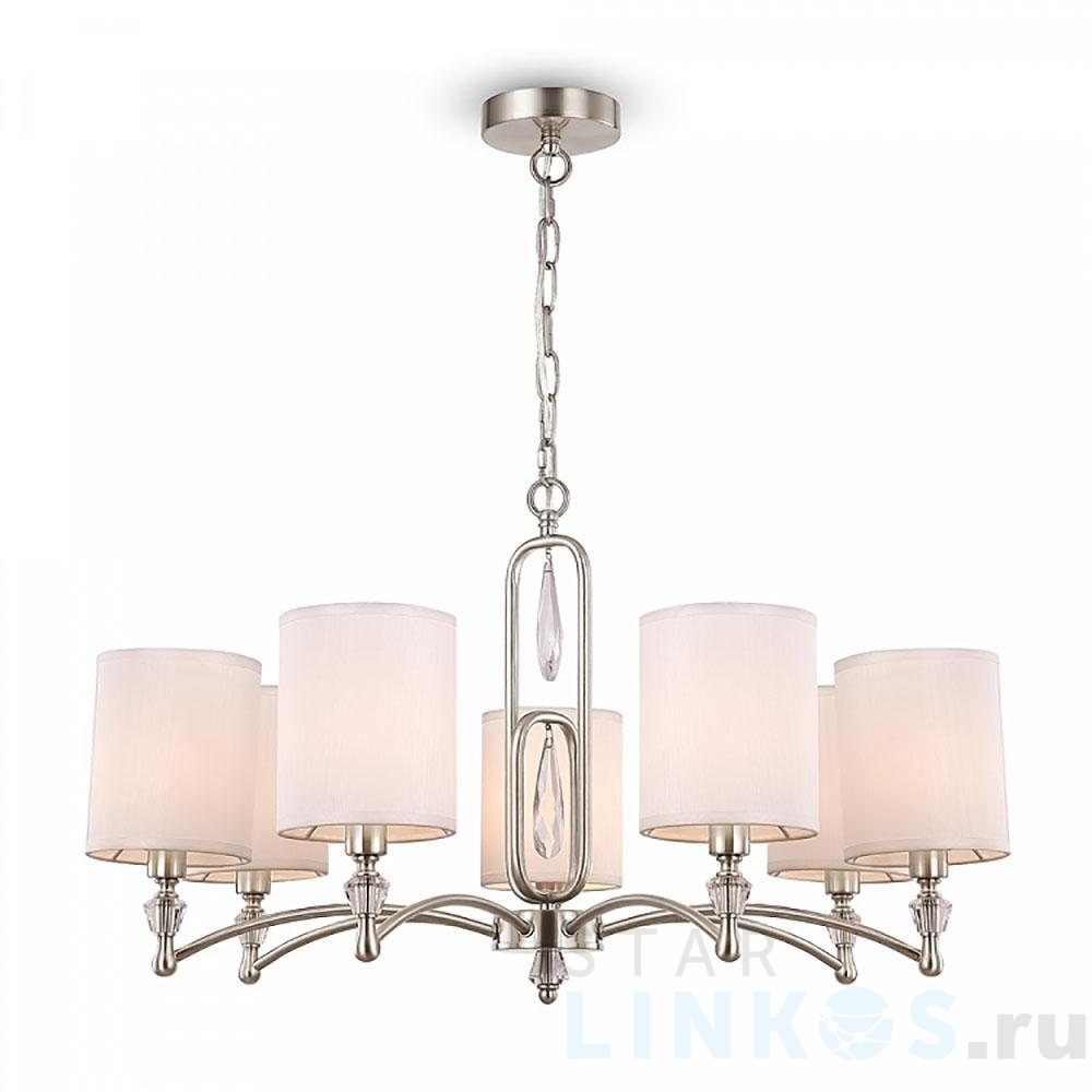 Поставщик рекомендует использовать лампы накаливания с цоколем E14. Подвесная люстра Freya Riverside FR1007PL-07N в используется в интерьере спальни с установкой на потолок.