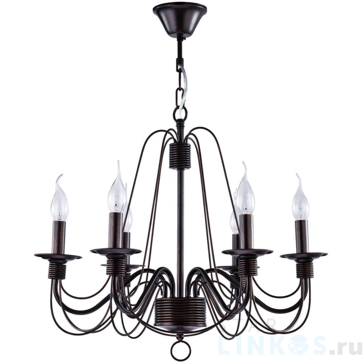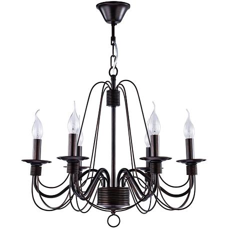 Поставщик рекомендует использовать лампы накаливания с цоколем E14 для освещения площади 20 м2. Подвесная люстра Freya Velia FR2046-PL-06-BR в кантри-стиле используется в интерьере спальни с установкой на потолок.