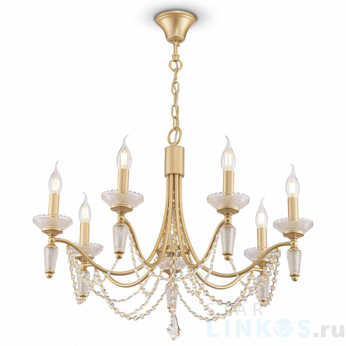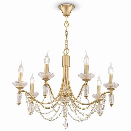 Поставщик рекомендует использовать лампы накаливания с цоколем E14 для освещения площади 15,6 м2. Подвесная люстра Freya Zoe FR2009PL-07G в классическом стиле используется в интерьере гостиной с установкой на потолок.
