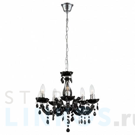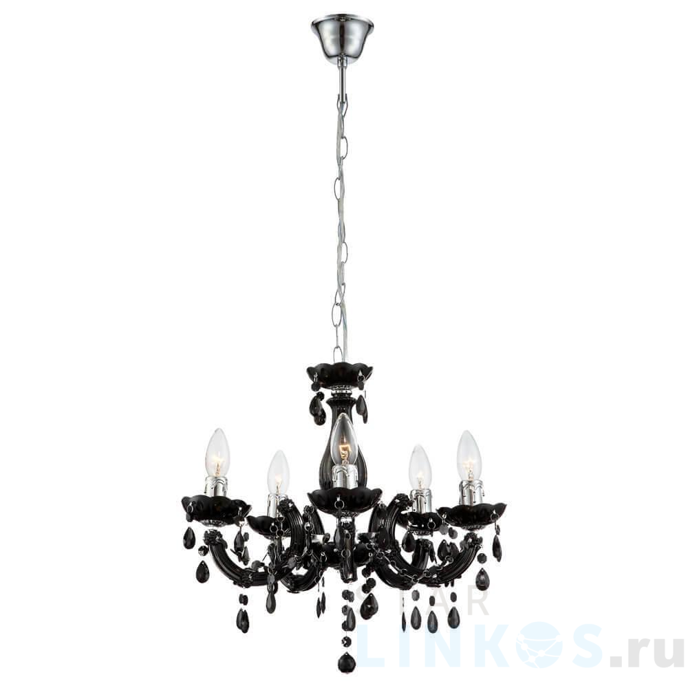 Поставщик рекомендует использовать лампы накаливания с цоколем E14 для освещения площади 11,1 м2. Подвесная люстра Globo Cuimbra II 63110-5 в классическом стиле используется в интерьере спальни с установкой на потолок.