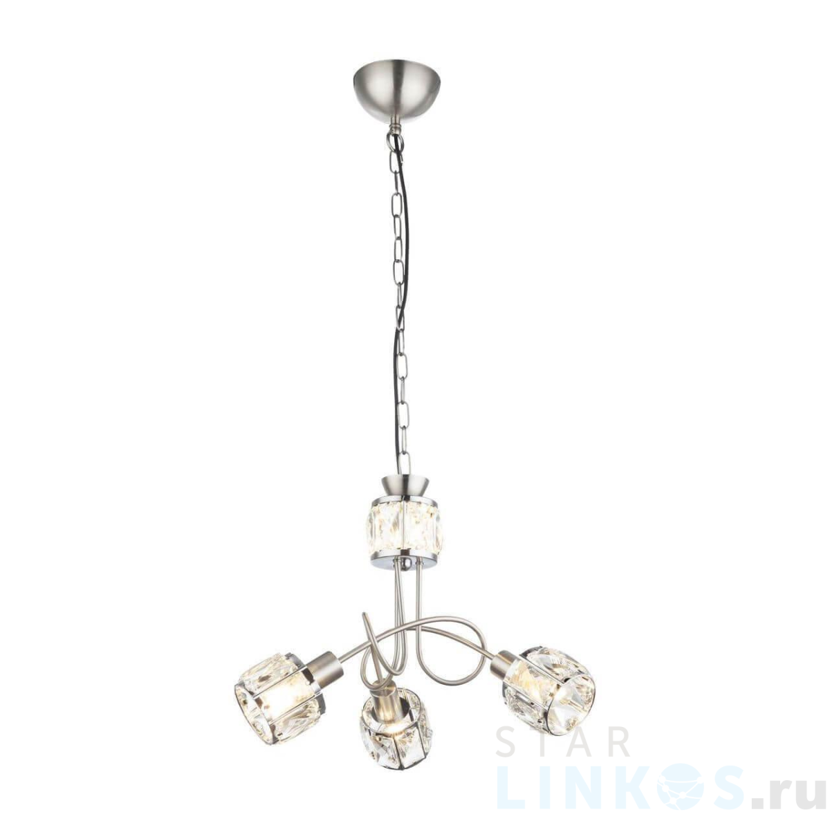 Поставщик рекомендует использовать лампы накаливания с цоколем E14 для освещения площади 6,7 м2. Подвесная люстра Globo Kris 54356-3H в современном стиле используется в интерьере кухни с установкой на потолок.