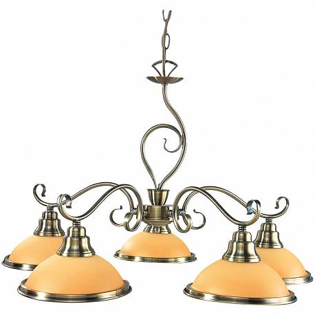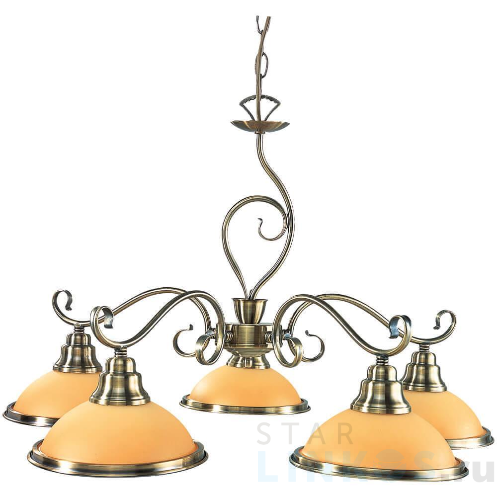 Поставщик рекомендует использовать лампы накаливания с цоколем E27 для освещения площади 16,7 м2. Подвесная люстра Globo Sassari 6905-5 в кантри-стиле используется в интерьере кухни с установкой на потолок.