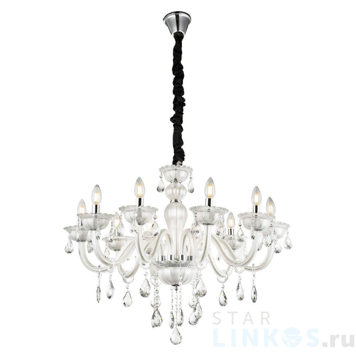 Поставщик рекомендует использовать лампы накаливания с цоколем E14 для освещения площади 22,2 м2. Подвесная люстра Globo Teejay 64118-10 в классическом стиле используется в интерьере гостиной с установкой на потолок.