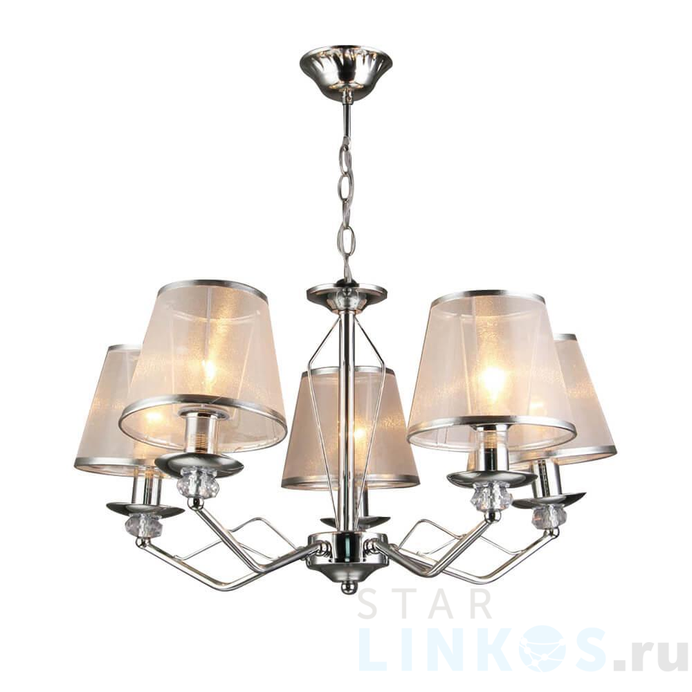 Поставщик рекомендует использовать лампы накаливания с цоколем E27 для освещения площади 16,7 м2. Подвесная люстра Hiper Amelia H027-5 в используется в интерьере спальни с установкой на потолок.