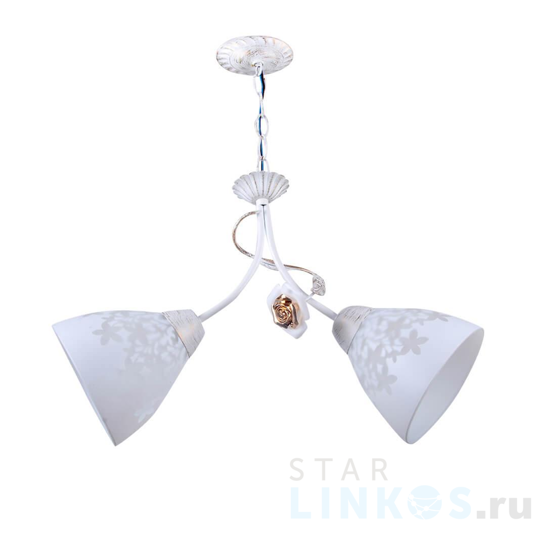 Поставщик рекомендует использовать лампы накаливания с цоколем E27 для освещения площади 6,7 м2. Подвесная люстра Hiper Modern H136-2 в стиле прованс используется в интерьере спальни с установкой на потолок.