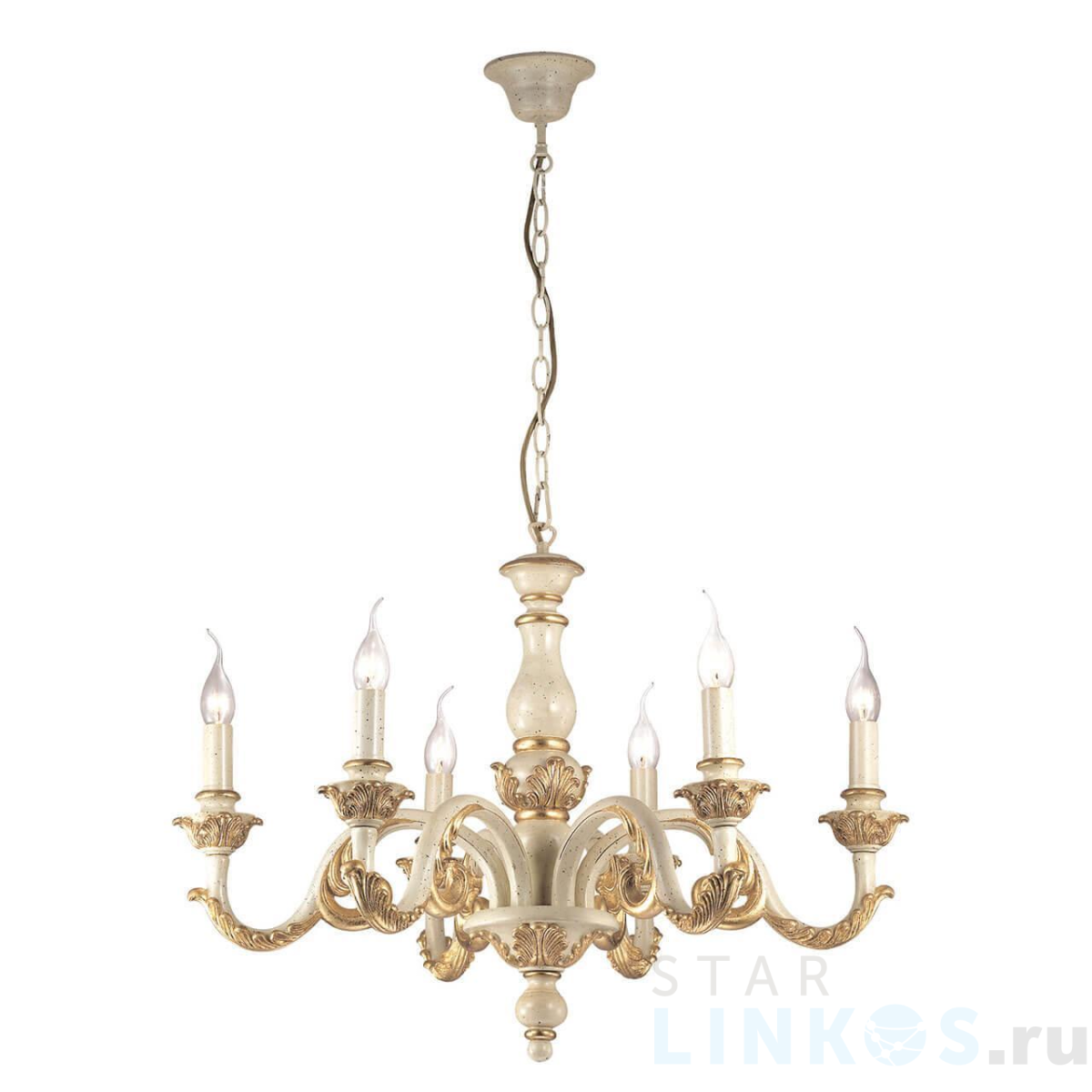 Поставщик рекомендует использовать лампы накаливания с цоколем E14 для освещения площади 13,3 м2. Подвесная люстра Ideal Lux Giglio Sp6 075327 в классическом стиле используется в интерьере спальни с установкой на потолок.
