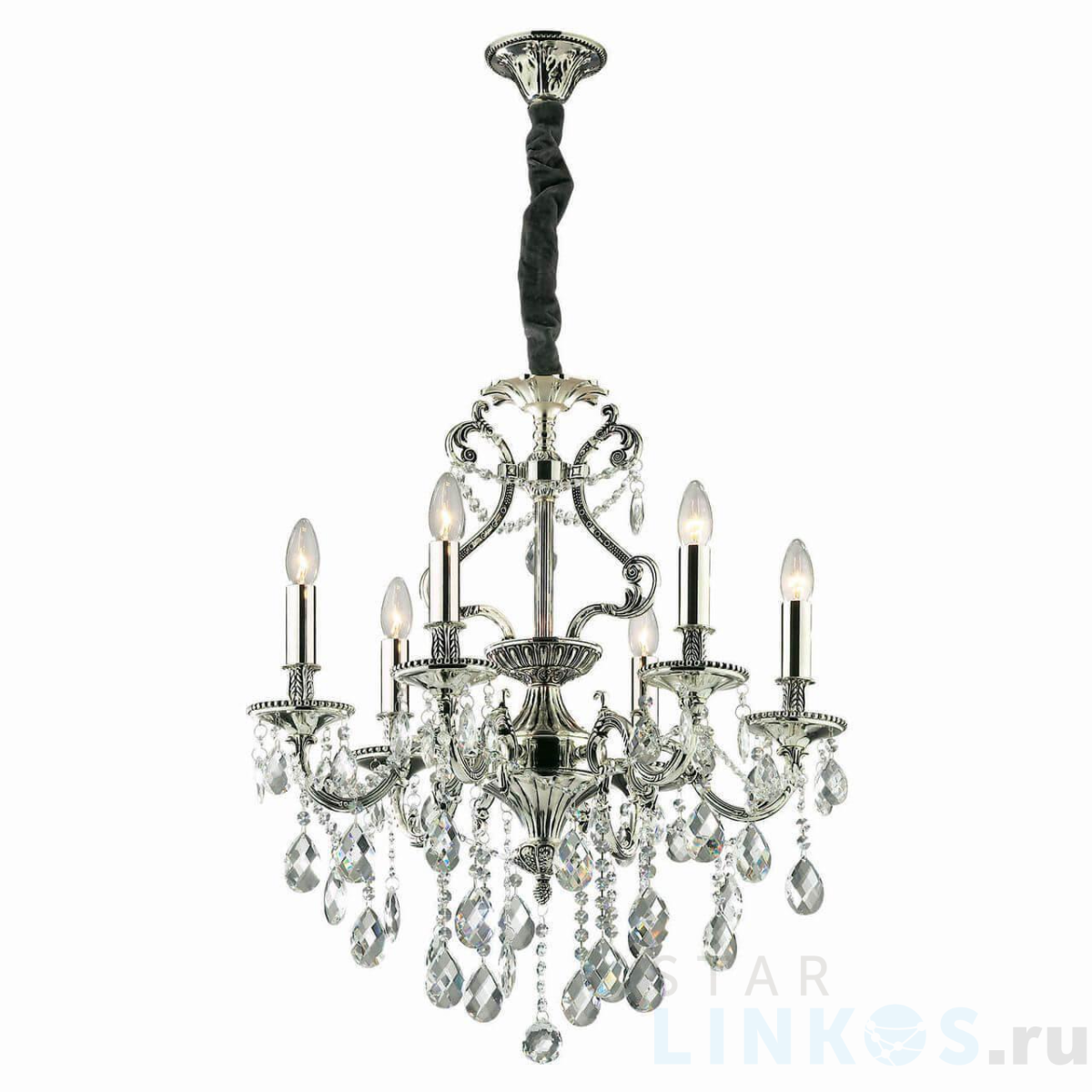 Поставщик рекомендует использовать лампы накаливания с цоколем E14 для освещения площади 13,3 м2. Подвесная люстра Ideal Lux Gioconda SP6 Argento 044927 в классическом стиле используется в интерьере спальни с установкой на потолок.