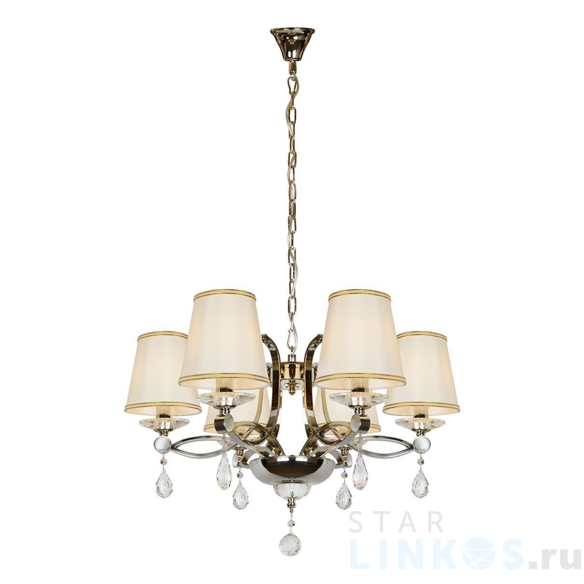 Поставщик рекомендует использовать лампы накаливания с цоколем E14 для освещения площади 13,3 м2. Подвесная люстра iLamp Cento P7505-6 Nic в стиле арт-деко используется в интерьере спальни с установкой на потолок.