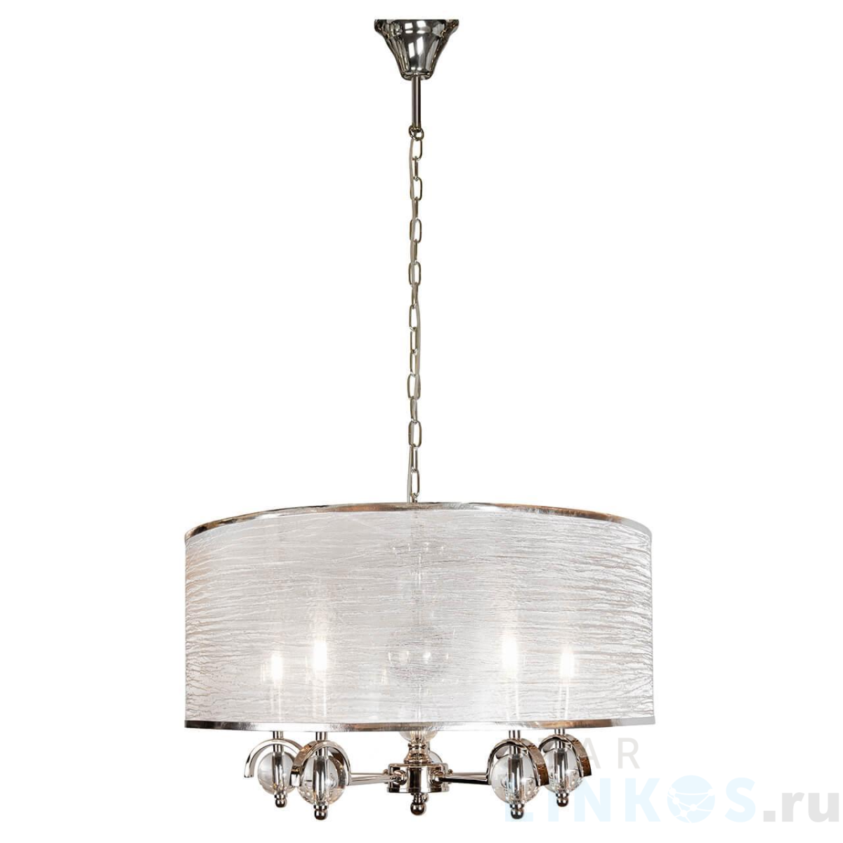 Поставщик рекомендует использовать лампы накаливания с цоколем E14 для освещения площади 11,1 м2. Подвесная люстра iLamp Chelsea P2400-5 Nickel в стиле арт-деко используется в интерьере спальни с установкой на потолок.
