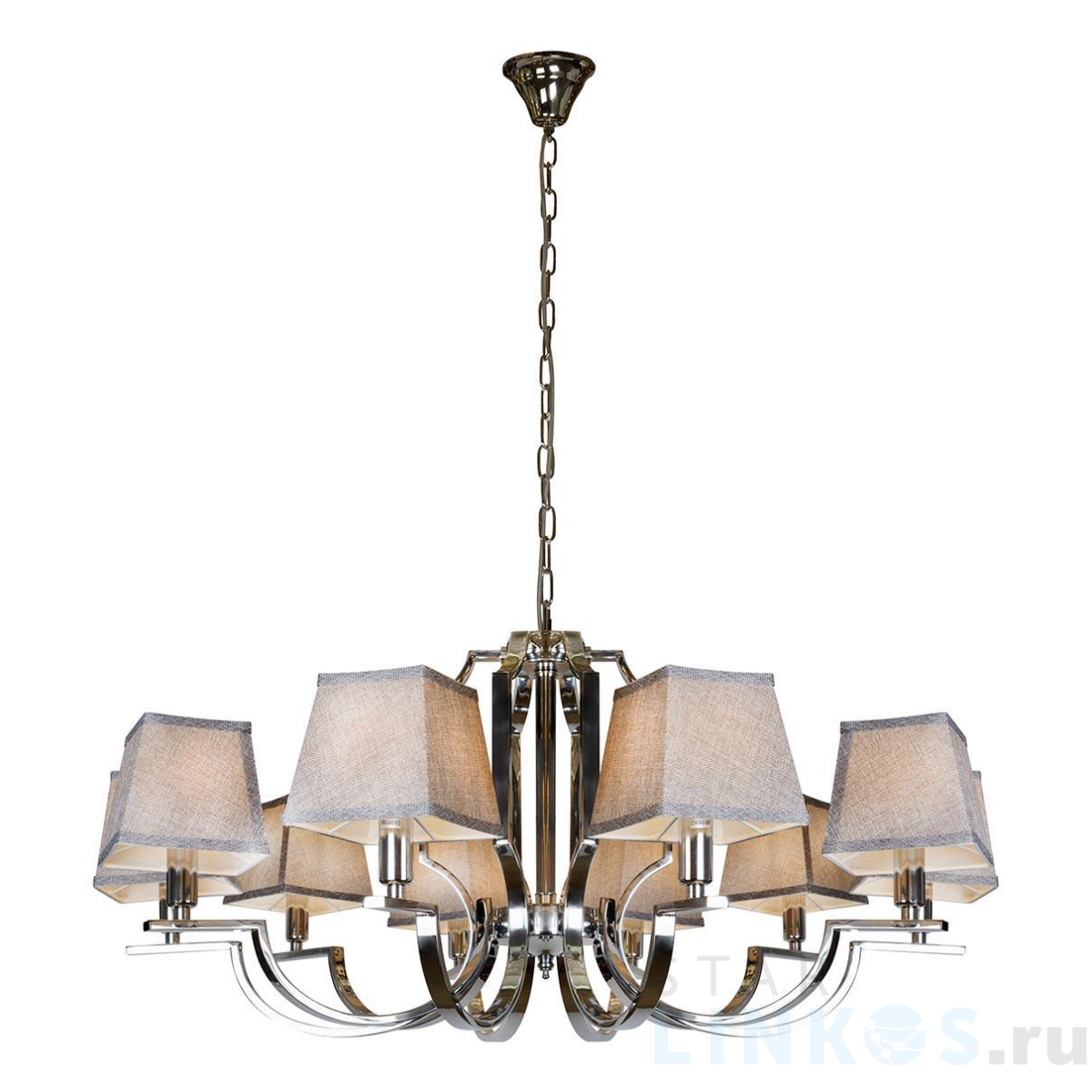 Поставщик рекомендует использовать лампы накаливания с цоколем E14 для освещения площади 22,2 м2. Подвесная люстра iLamp Hilton 6943-10 CR в используется в интерьере гостиной с установкой на потолок.