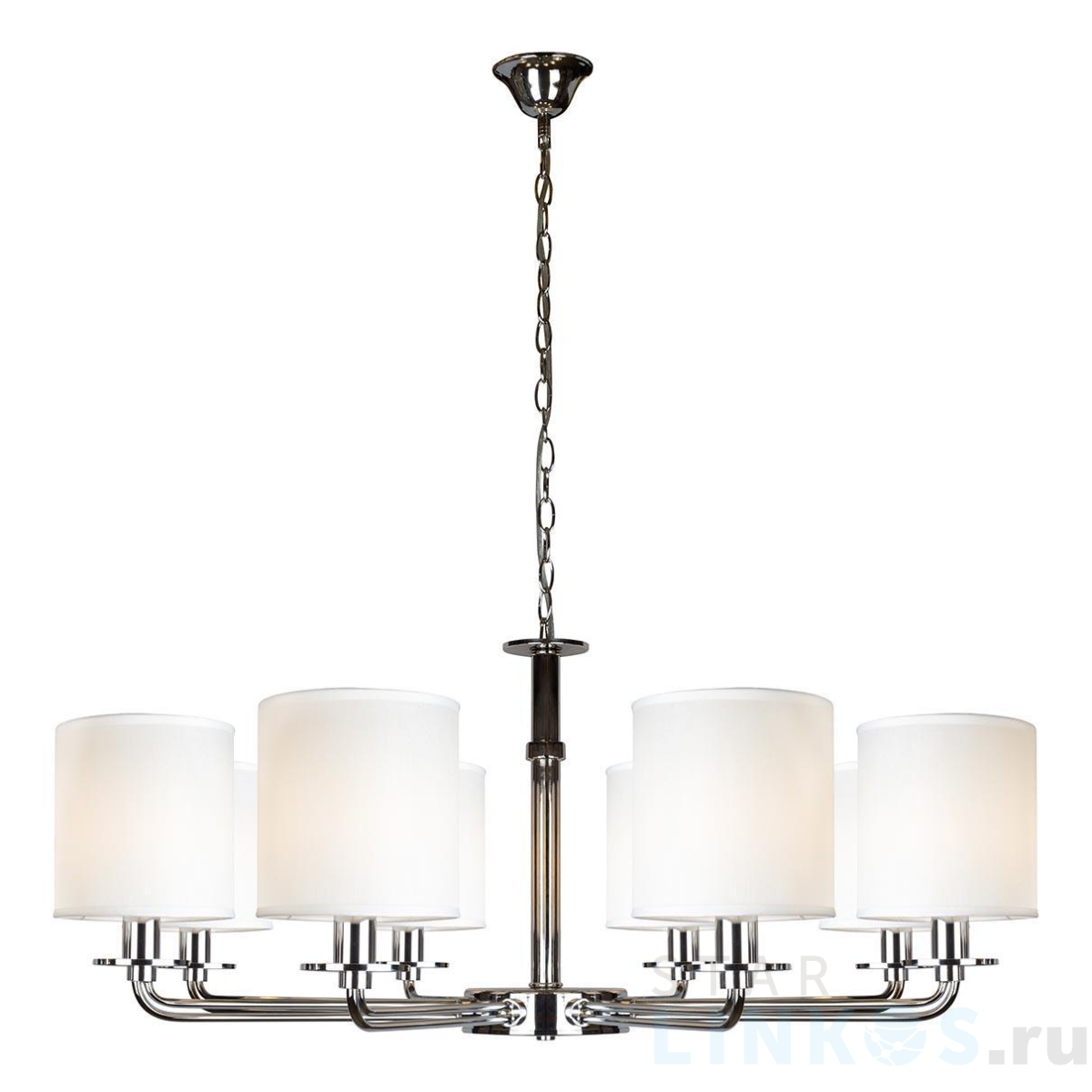 Поставщик рекомендует использовать лампы накаливания с цоколем E14 для освещения площади 17,8 м2. Подвесная люстра iLamp Joy RM003/8CR в используется в интерьере гостиной с установкой на потолок.
