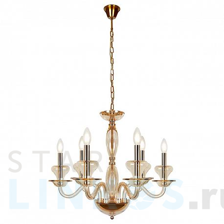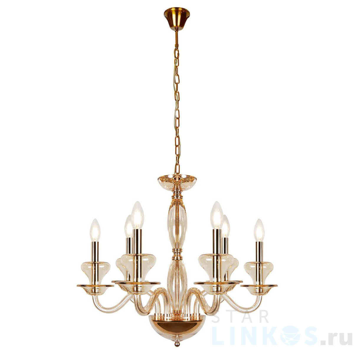 Поставщик рекомендует использовать лампы накаливания с цоколем E14 для освещения площади 13,3 м2. Подвесная люстра iLamp Mercury P9448-6 Gold в используется в интерьере спальни с установкой на потолок.
