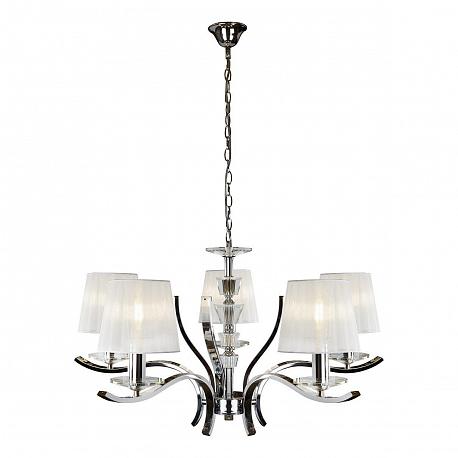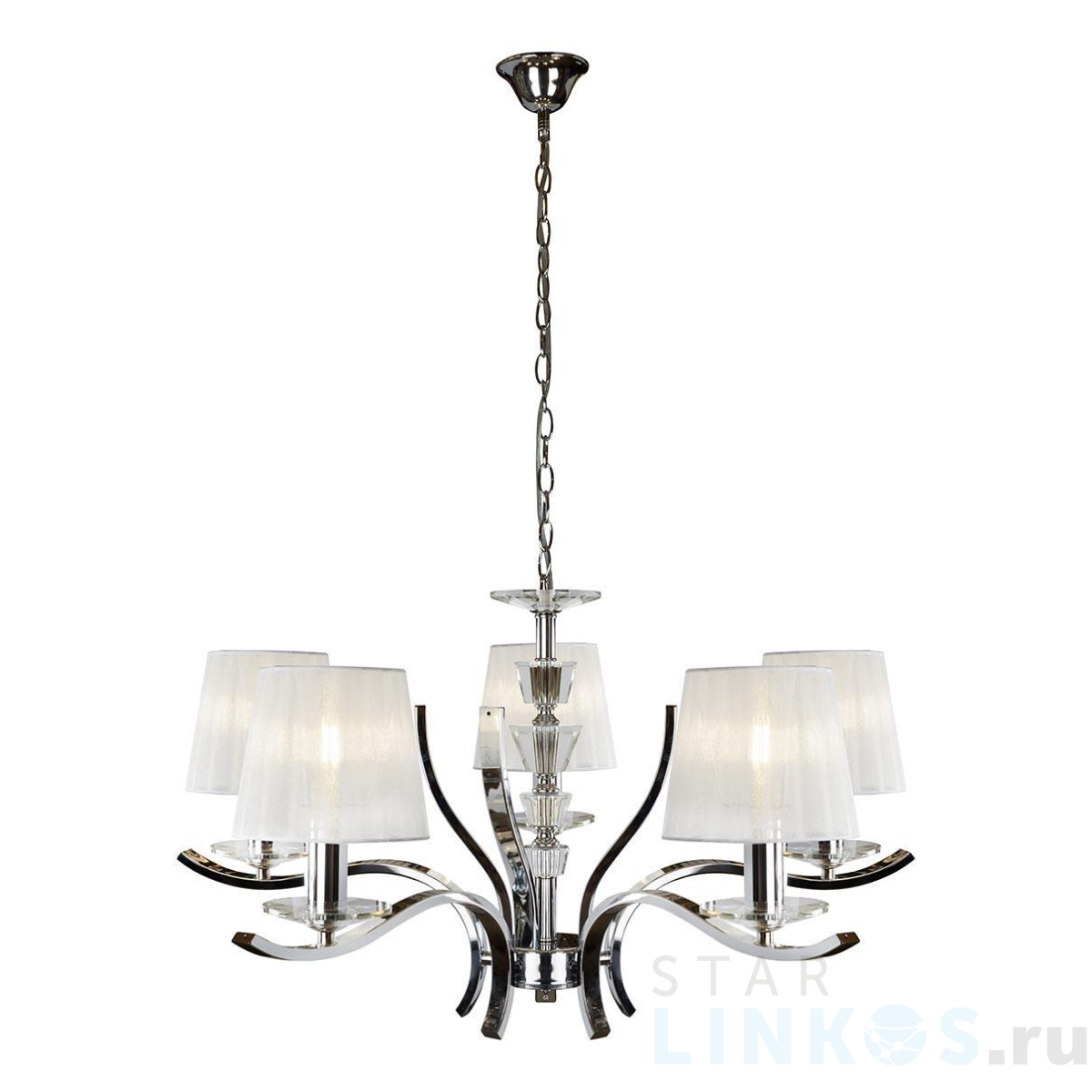 Поставщик рекомендует использовать лампы накаливания с цоколем E14 для освещения площади 11,1 м2. Подвесная люстра iLamp Omega RM5231/5CR в стиле арт-деко используется в интерьере спальни с установкой на потолок.