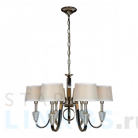 Поставщик рекомендует использовать лампы накаливания с цоколем E14 для освещения площади 13,3 м2. Подвесная люстра iLamp Opera 82177/6 CR в стиле арт-деко используется в интерьере спальни с установкой на потолок.