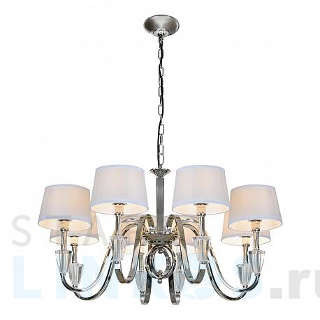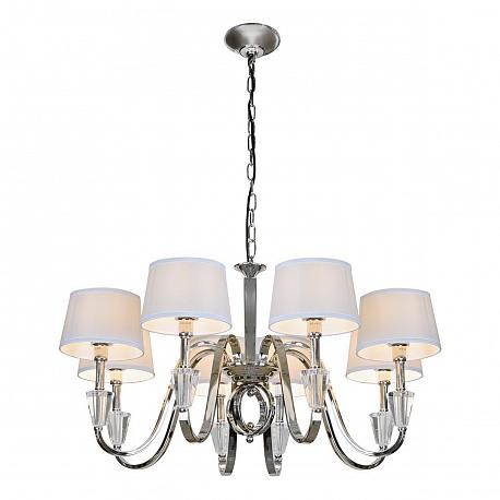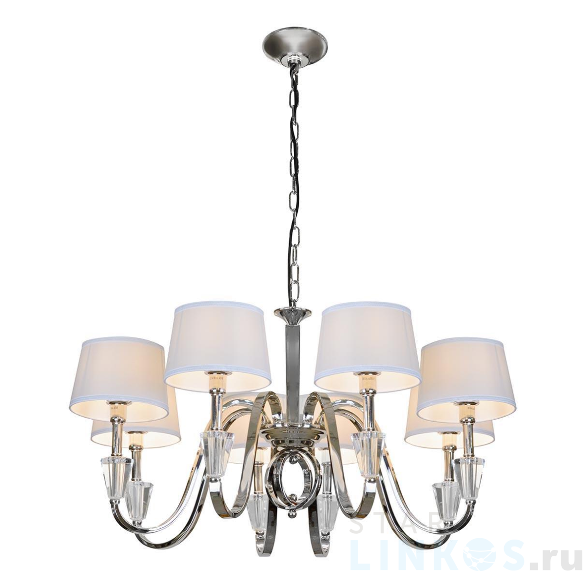 Поставщик рекомендует использовать лампы накаливания с цоколем E14 для освещения площади 17,8 м2. Подвесная люстра iLamp Opera 82177/8 CR в стиле арт-деко используется в интерьере гостиной с установкой на потолок.