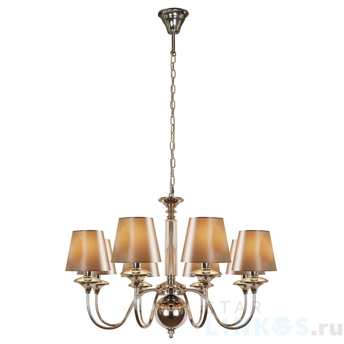 Поставщик рекомендует использовать лампы накаливания с цоколем E14 для освещения площади 17,8 м2. Подвесная люстра iLamp Rolling P2406-8 Nickel в используется в интерьере гостиной с установкой на потолок.