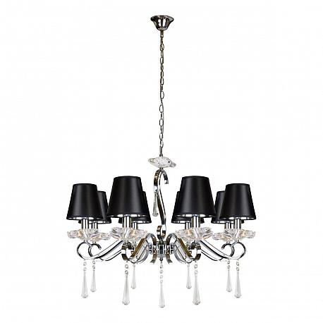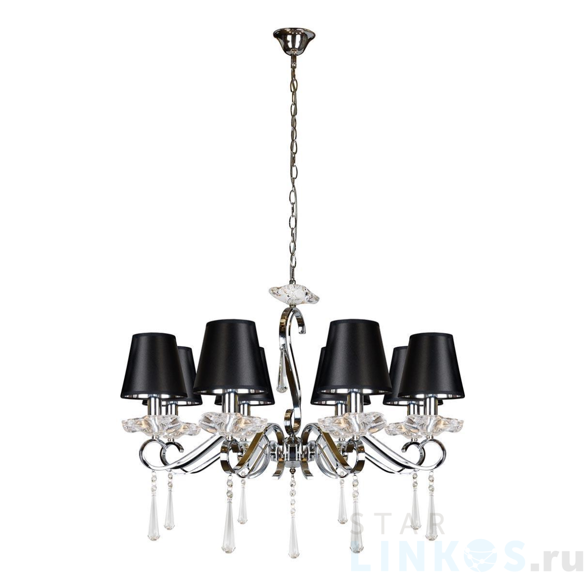 Поставщик рекомендует использовать лампы накаливания с цоколем E14 для освещения площади 17,8 м2. Подвесная люстра iLamp Stella RM1684/8CR в стиле арт-деко используется в интерьере гостиной с установкой на потолок.