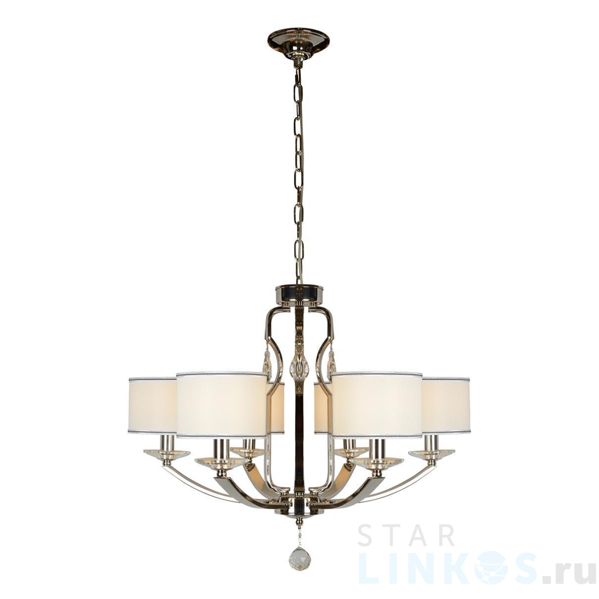 Поставщик рекомендует использовать лампы накаливания с цоколем E14 для освещения площади 13,3 м2. Подвесная люстра iLamp Urban 88189/6 CR в стиле арт-деко используется в интерьере спальни с установкой на потолок.