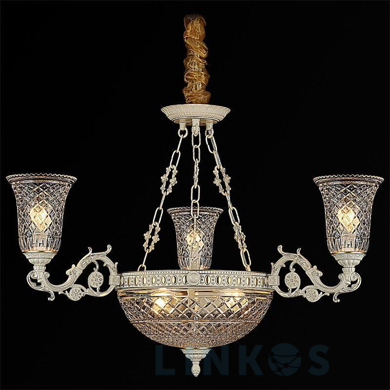 Поставщик рекомендует использовать лампы накаливания с цоколем E27 для освещения площади 64 м2. Подвесная люстра Illumico IL7286-6P-48 WT GD в замковом стиле используется в интерьере гостиной с установкой на потолок.