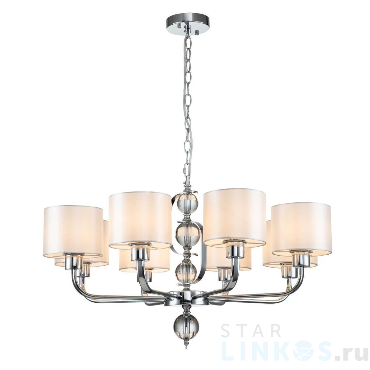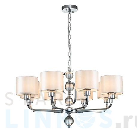 Поставщик рекомендует использовать лампы накаливания с цоколем E27 для освещения площади 20 м2. Подвесная люстра Indigo Davinci 13011/8P Chrome V000262 в используется в интерьере гостиной с установкой на потолок.