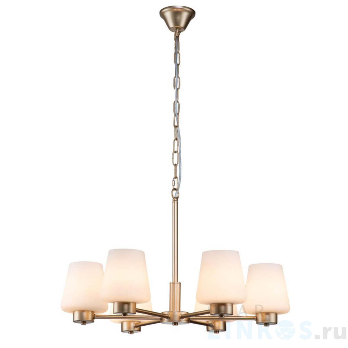 Поставщик рекомендует использовать лампы накаливания с цоколем E27 для освещения площади 12 м2. Подвесная люстра Indigo Tulip 13004/6P Gold V000001 в используется в интерьере кухни с установкой на потолок.