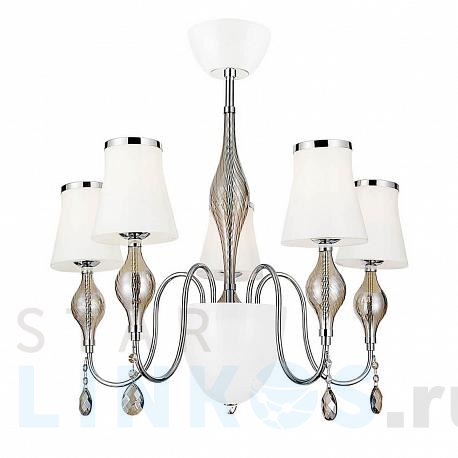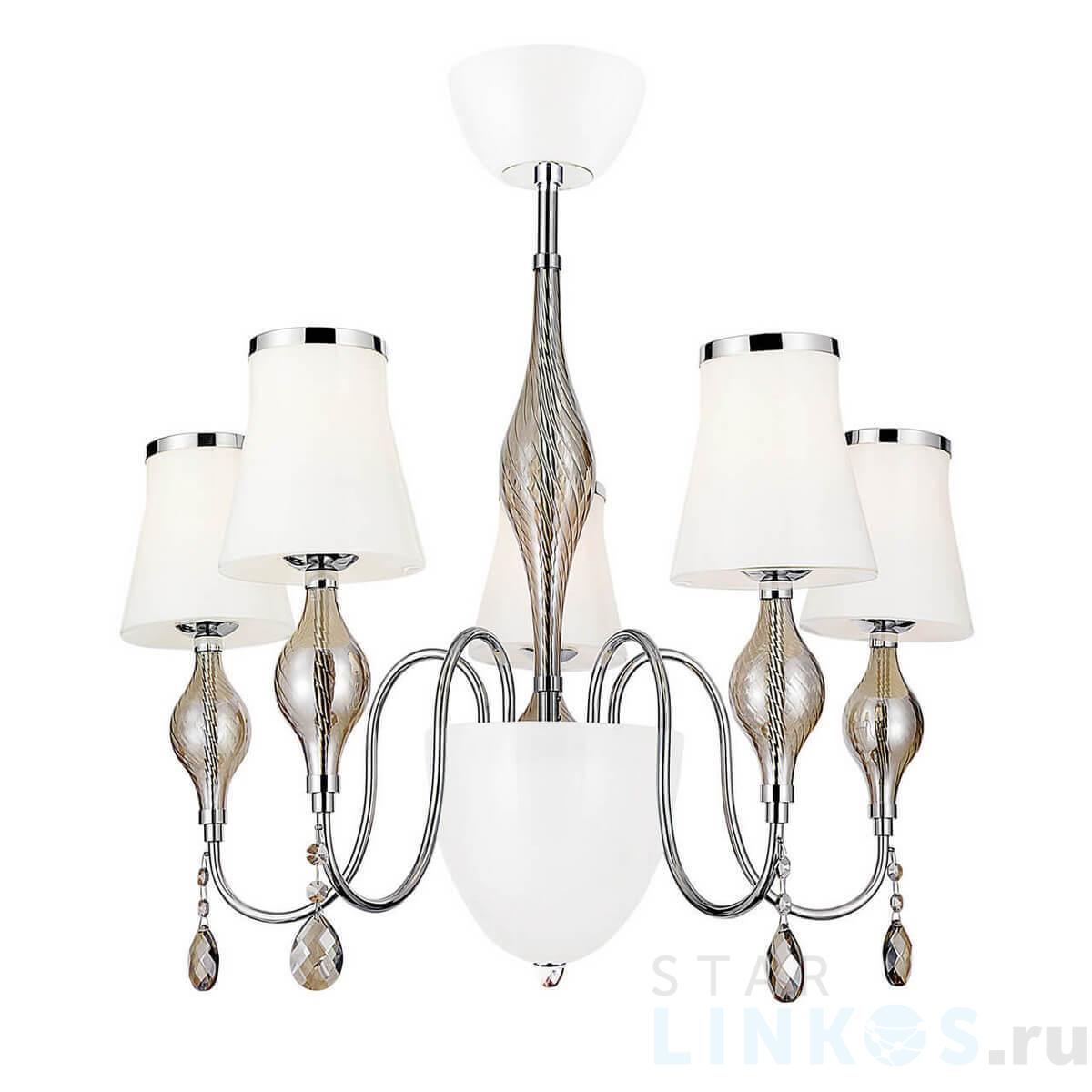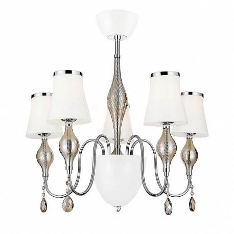 Поставщик рекомендует использовать лампы накаливания с цоколем E14 для освещения площади 11,1 м2. Подвесная люстра Lightstar Escica 806050 в стиле арт-деко используется в интерьере спальни с установкой на потолок.