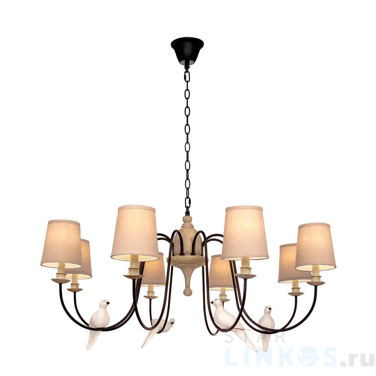 Поставщик рекомендует использовать лампы накаливания с цоколем E14 для освещения площади 17,8 м2. Потолочная чаша Loft1029A-8 в стиле прованс используется в интерьере гостиной с установкой на потолок.