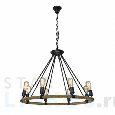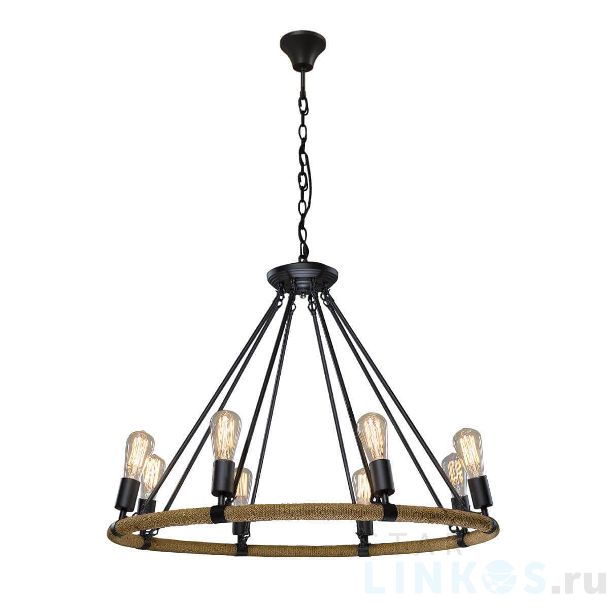 Поставщик рекомендует использовать лампы накаливания с цоколем E27 для освещения площади 26,7 м2. Подвесная люстра Loft IT Rope Filament Loft1861/8 в стиле лофт используется в интерьере кафе и ресторанов с установкой на потолок.