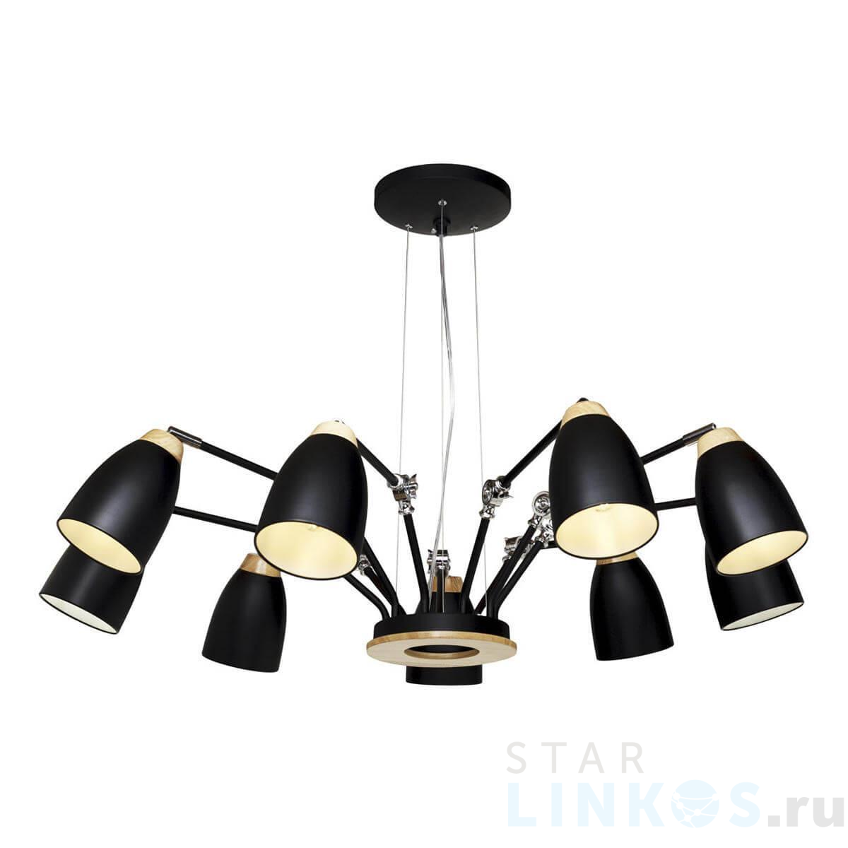 Поставщик рекомендует использовать лампы накаливания с цоколем E27 для освещения площади 30 м2. Подвесная люстра Loft IT Watchman Loft4402/9Bl в используется в интерьере гостиной с установкой на потолок.