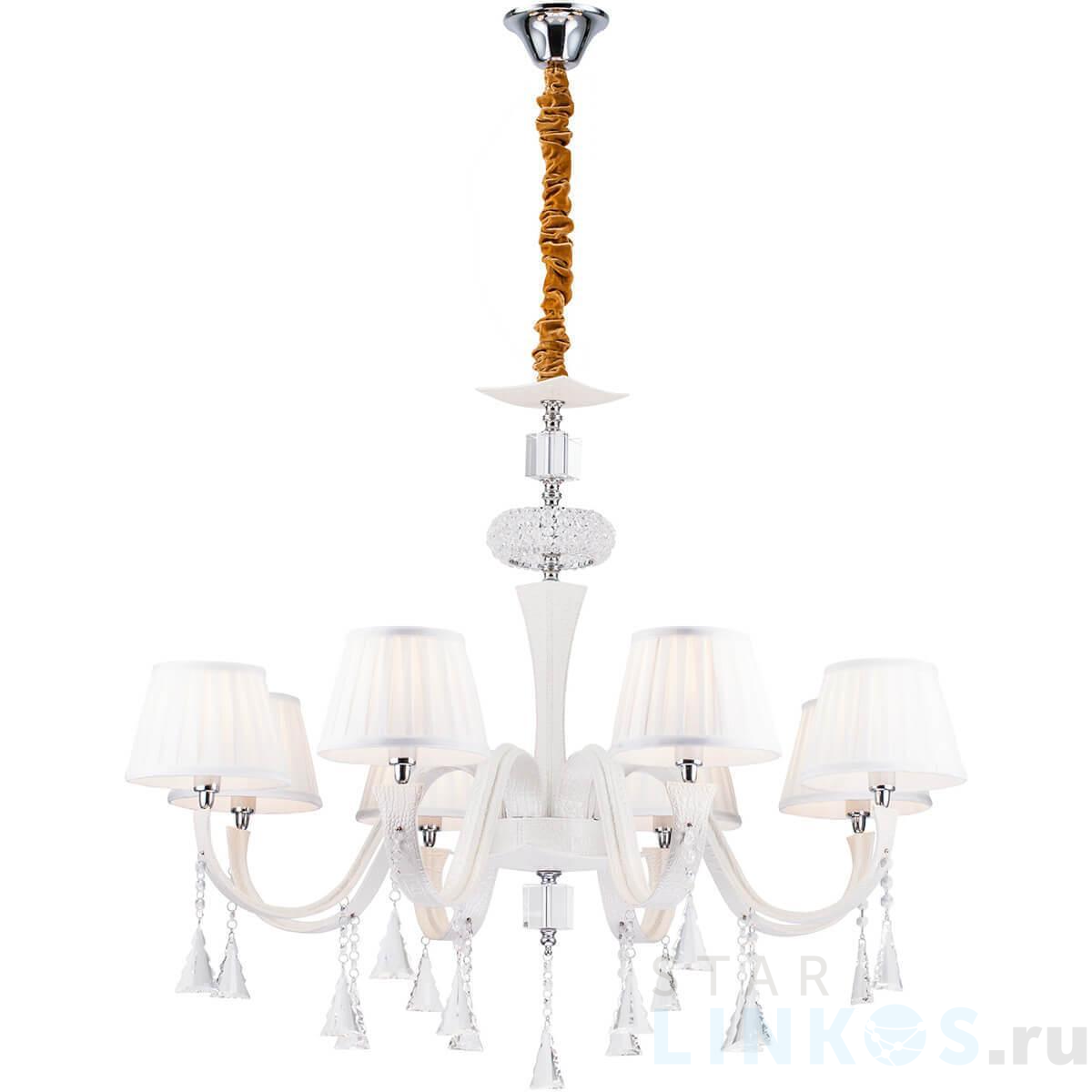 Поставщик рекомендует использовать лампы накаливания с цоколем E14 для освещения площади 26,7 м2. Подвесная люстра Lucia Tucci Pelle Bianca 119.8 в используется в интерьере гостиной с установкой на потолок.