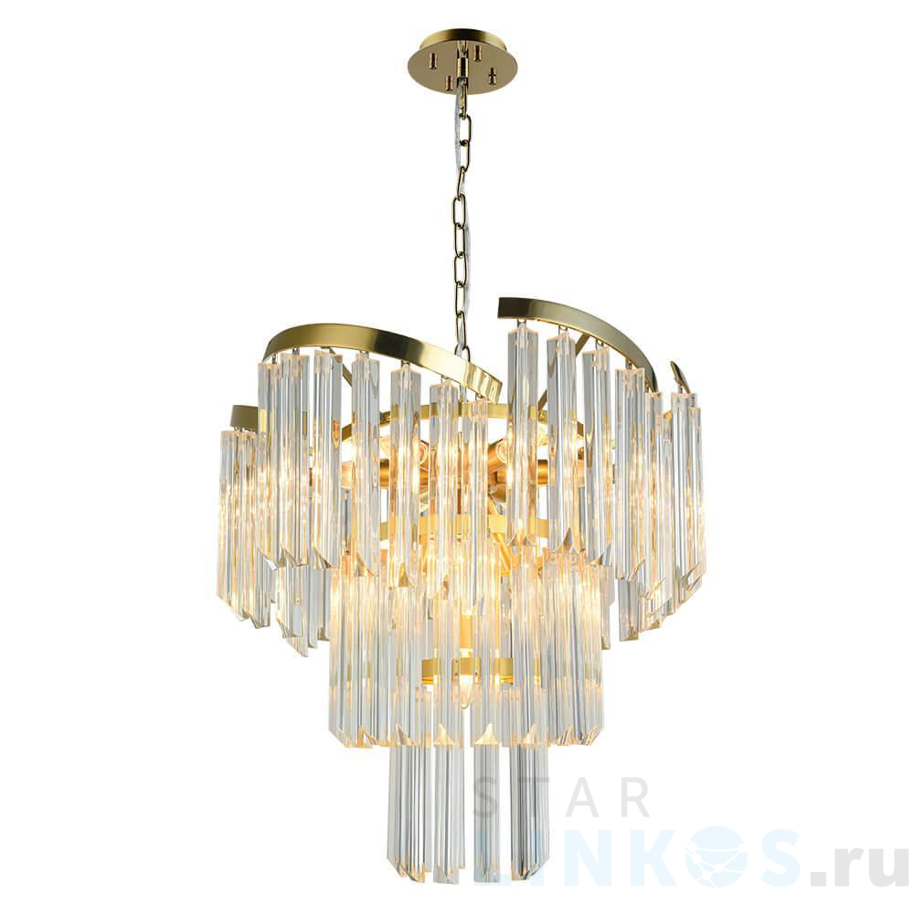 Поставщик рекомендует использовать лампы накаливания с цоколем E14 для освещения площади 22,2 м2. Подвесная люстра Lumien Hall Гарленда LH0042/10P-GDCG в классическом стиле используется в интерьере гостиной с установкой на потолок.