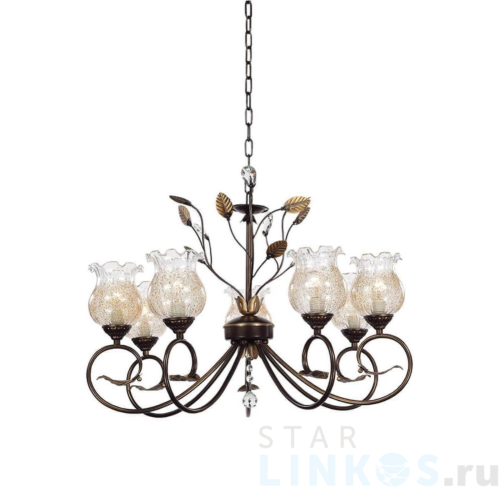 Поставщик рекомендует использовать лампы накаливания с цоколем E14 для освещения площади 21 м2. Подвесная люстра Lumien Hall Хели H17049/7LPG в кантри-стиле используется с установкой на потолок.