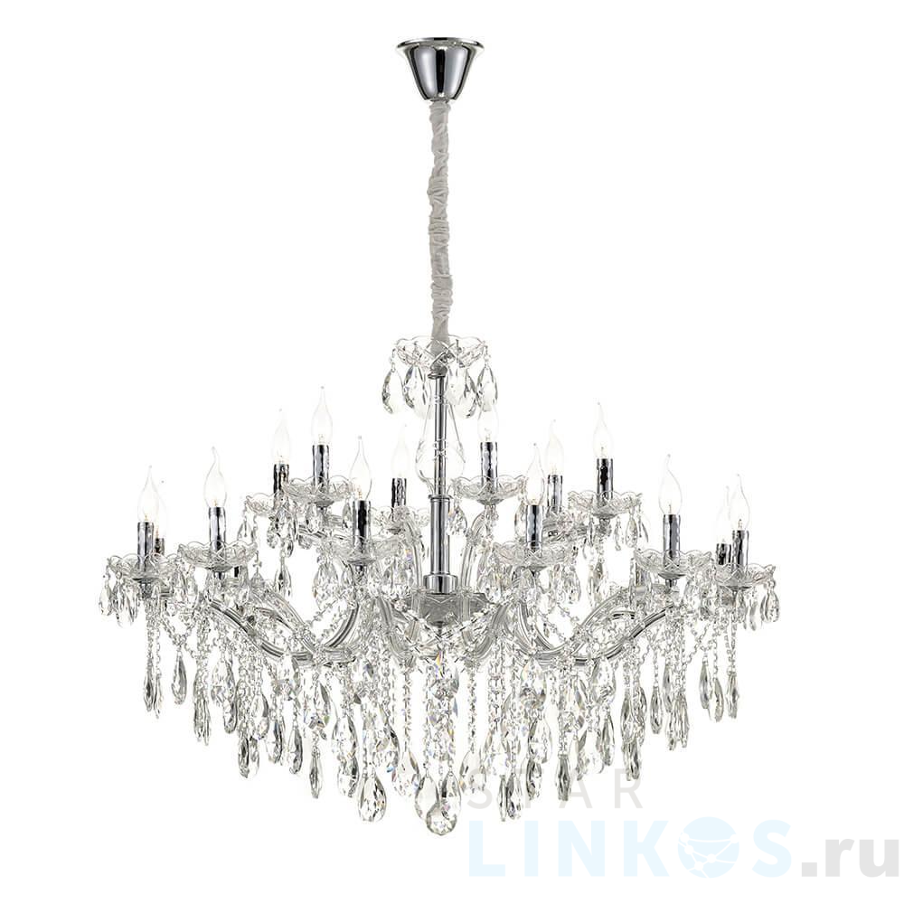 Поставщик рекомендует использовать лампы накаливания с цоколем E14 для освещения площади 40 м2. Подвесная люстра Lumien Hall Lavena LH0026/18H-CR в классическом стиле используется в интерьере гостиной с установкой на потолок.