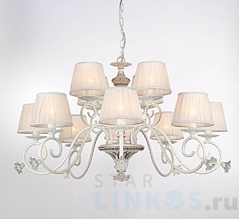 Поставщик рекомендует использовать лампы накаливания с цоколем E14 для освещения площади 36 м2. Подвесная люстра Lumien Hall Летисия H17075/12HEW в классическом стиле используется с установкой на потолок.
