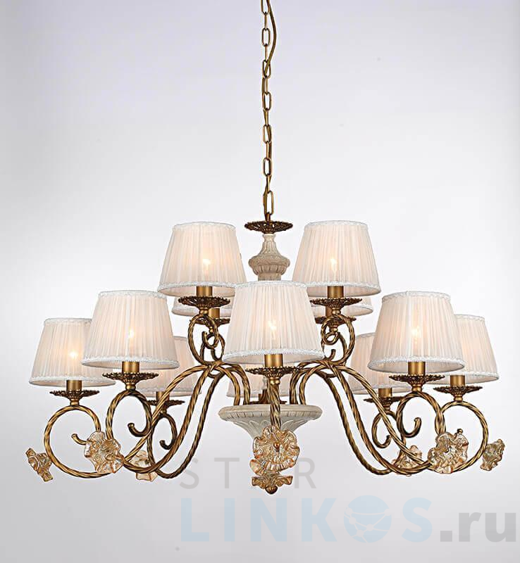 Поставщик рекомендует использовать лампы накаливания с цоколем E14 для освещения площади 36 м2. Подвесная люстра Lumien Hall Летисия H17075/12PCC в классическом стиле используется с установкой на потолок.